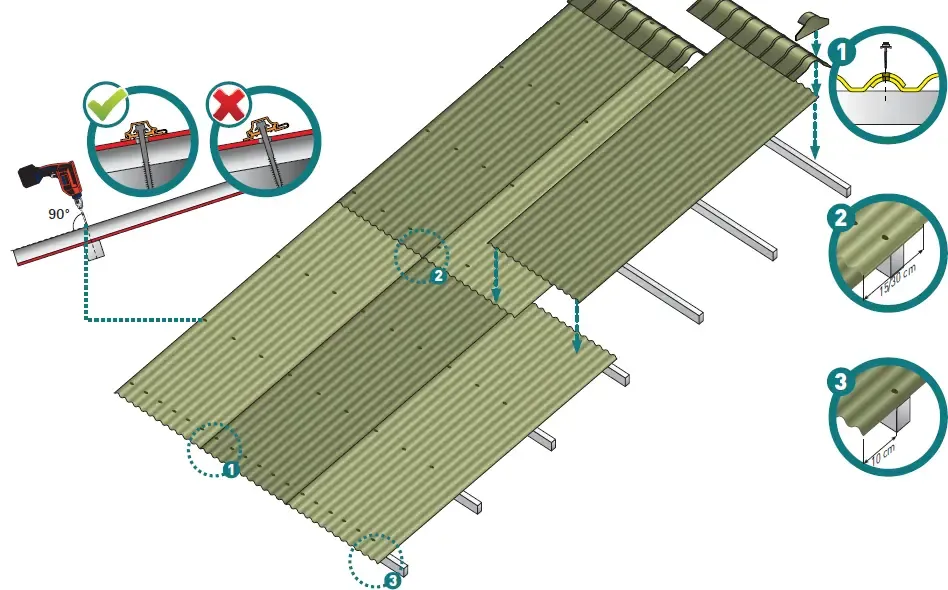 Sormonto laterale: Il sormonto deve essere effettuato sovrapponendo la prima onda dell’Ecolina da posare sull’ultima di quella già posata. Far attenzione a prevedere il fissaggio in corrispondenza del sormonto.